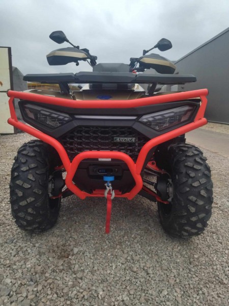 Doprava ZDARMA 5-ročná záruka Odpočet DPH Na splátky Výbava: - Plne nastaviteľné tlmiče - Atraktívne 14" osemlúčové kolesá Beadlock s 26" pneumatikami Bulldog - Sedačka a opierka chrbta spolujazdca - Farebne lakované masívne predné a zadné oceľové nárazníky - A-ramená a pružiny - Hliníkové stupne. - Elektrický posilňovač riadenia - Homologované ťažné zariadenie - Navijak 3000 lbs - Veľký plnofarebný 7 TFT displej - 12V zásuvka a USB port.